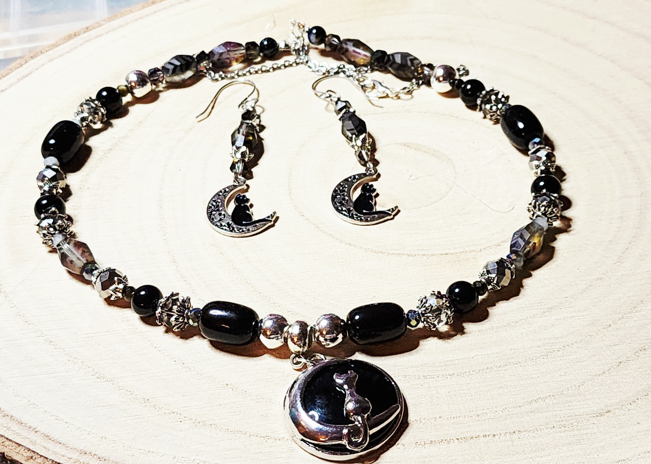 handmade jewelry, celestial necklace, moon earrings, cat jewelry, whimsical accessories, gift for her, moon and stars, cosmic jewelry, festive jewelry, black bead necklace, Goimagine artisan, holiday gift
