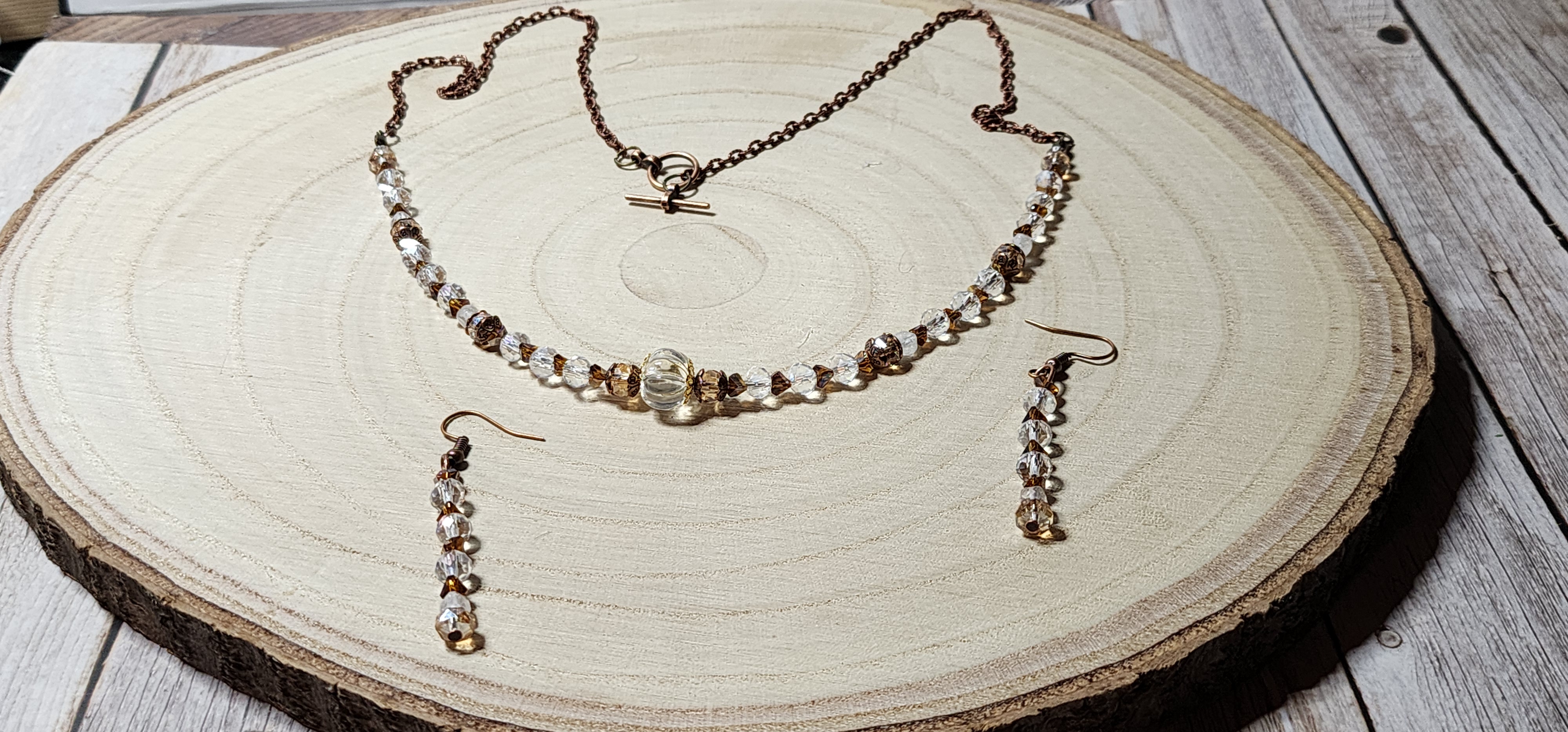 ✨ Features: • Clear faceted Czech glass beads • Warm amber/brown crystal accents • Copper findings and toggle clasp • Matching dangle earrings • Lightweight, comfortable, and elegant • Perfect for holiday gifting