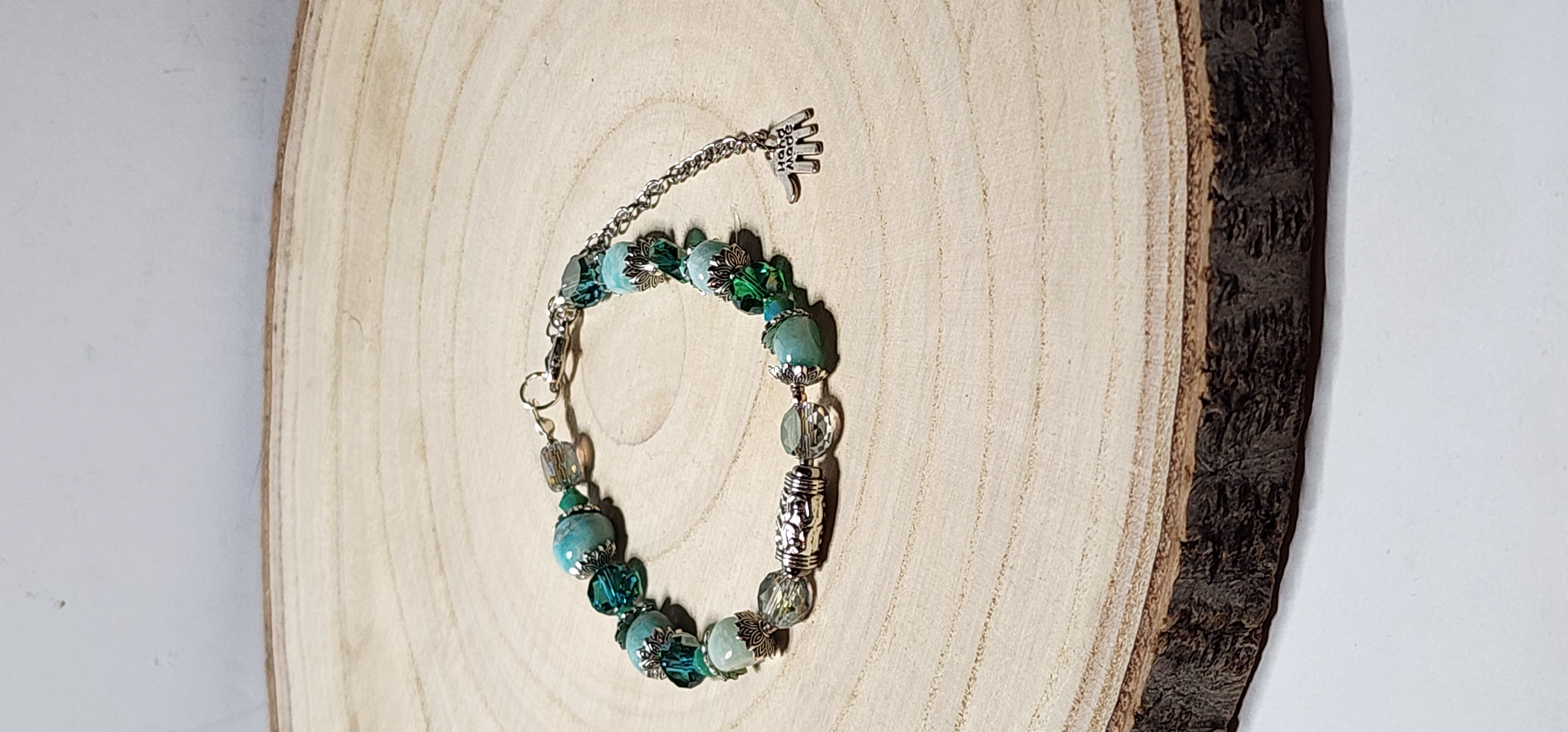 This bracelet is lovingly handcrafted using high-quality Amazonite gemstone and crystal beads in rich green and gold hues. Each bead is individually strung on durable jewelry wire, accented with detailed metal bead caps and spacers, then finished with a lobster clasp and extender chain. Every piece is assembled by hand in my small studio, ensuring a beautiful, lasting finish and a one-of-a-kind design.