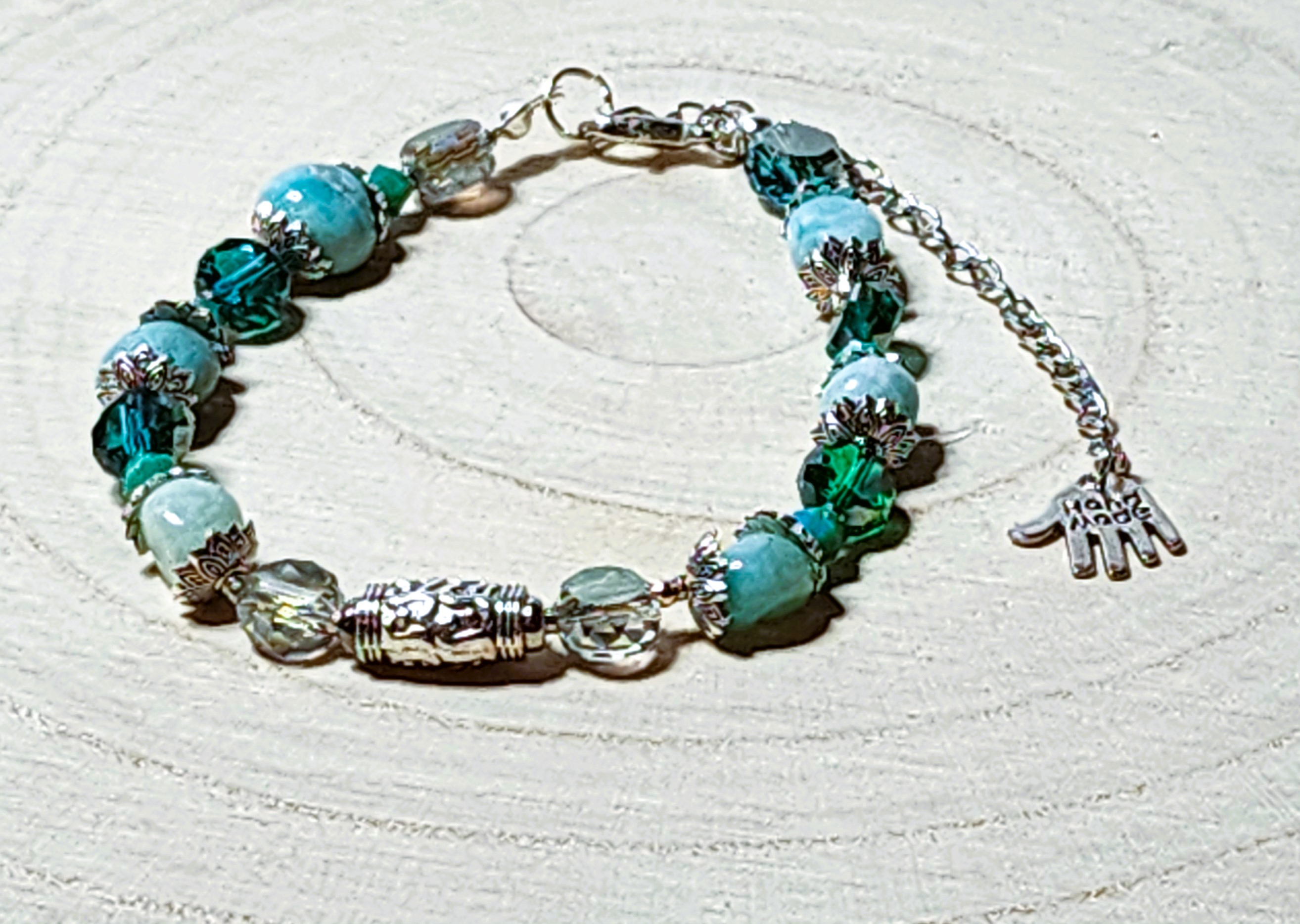 The bracelet features a blend of glass and crystal beads, intricate silver-tone spacers, and a “handmade with love” charm that makes it truly one-of-a-kind. ?