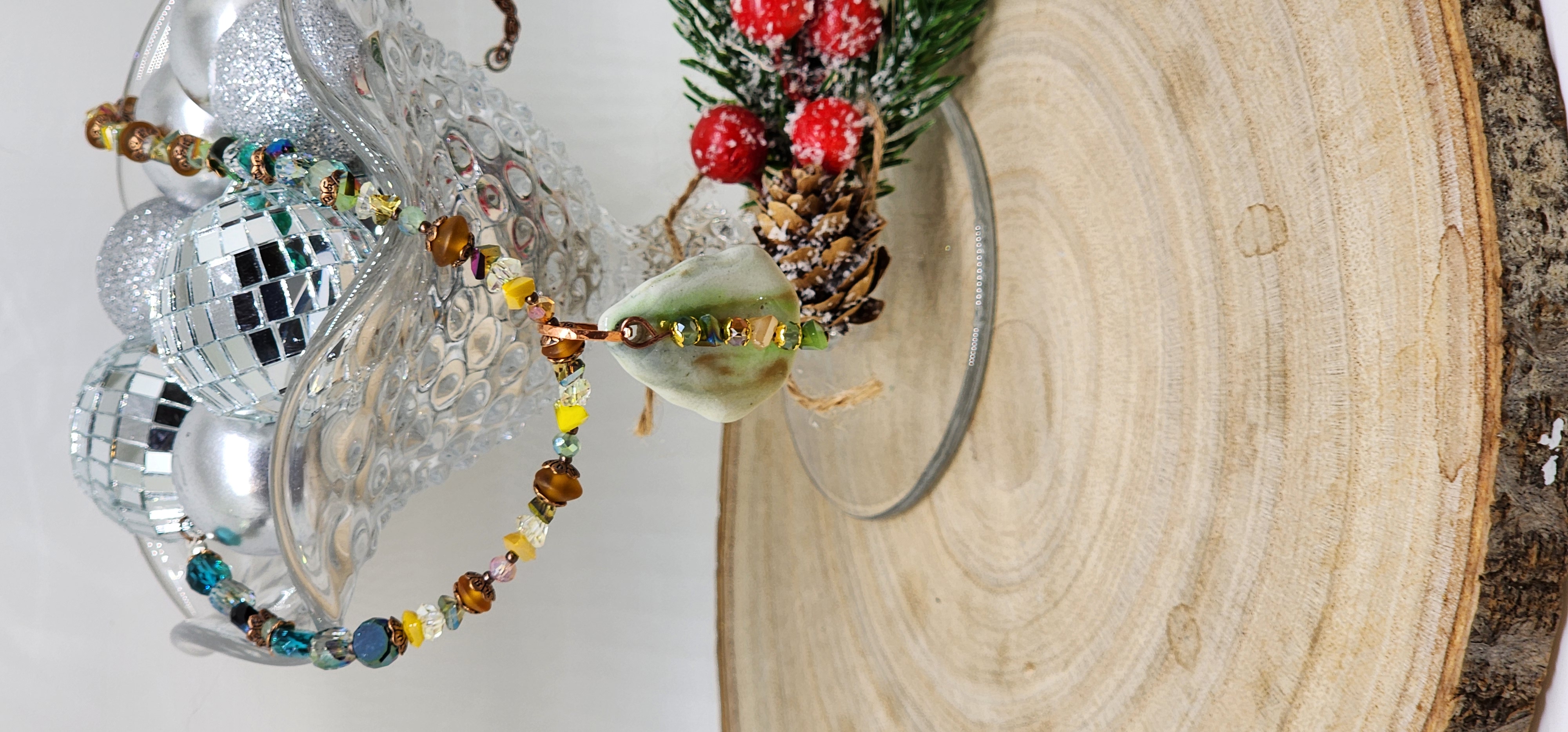 Step into the magic of the forest with this handcrafted green agate leaf pendant necklace – a one-of-a-kind piece that blends earthy elegance with festive charm. The polished green agate pendant, shaped like a delicate leaf, evokes the serenity of winter woods and the sparkle of holiday gatherings. Accented with a mix of metallic, glass, and ceramic beads in rich seasonal hues, this necklace is a celebration of nature’s beauty and artisan craftsmanship.