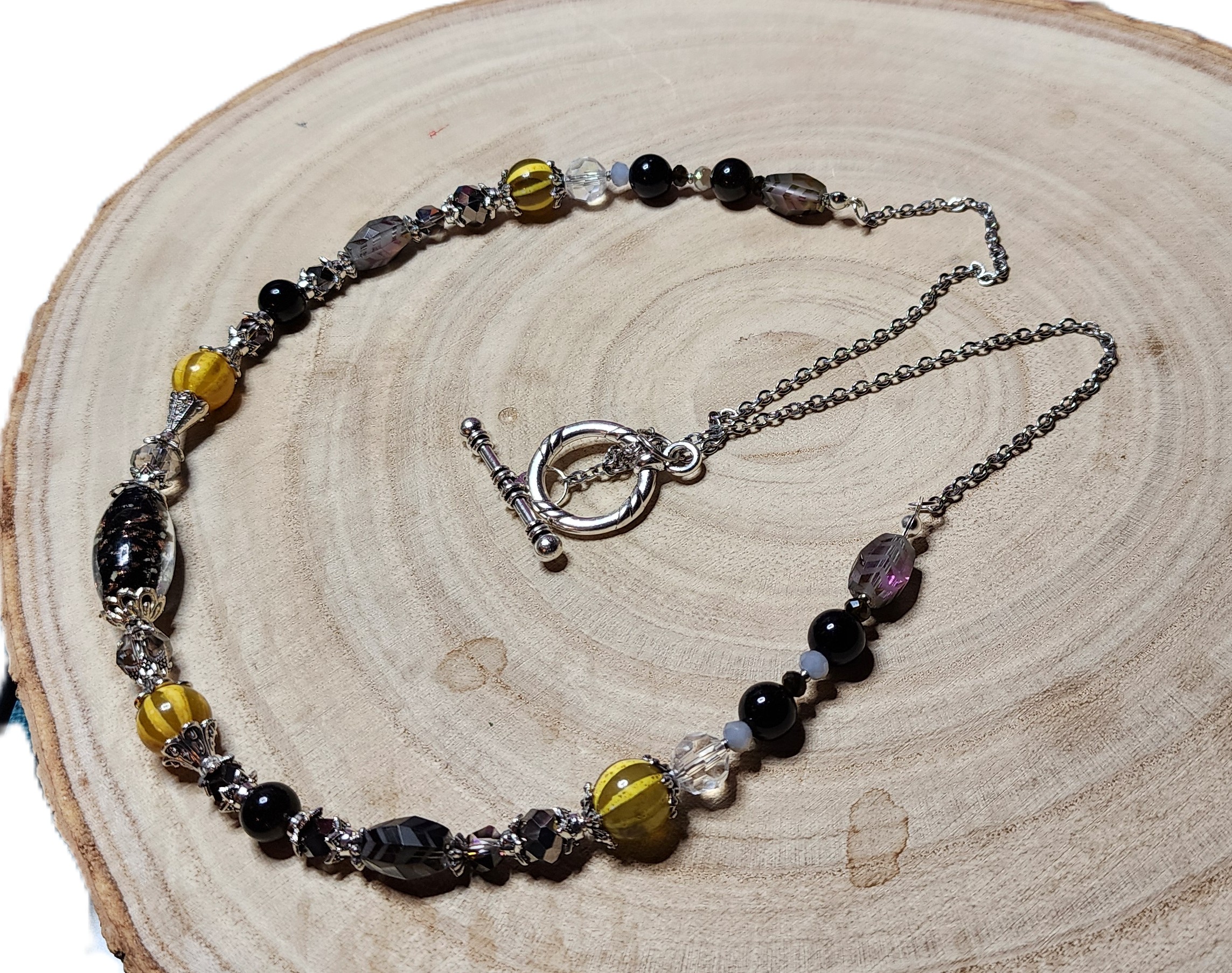 This one-of-a-kind necklace features a striking mix of black glass beads, smoky crystal accents, clear faceted crystals, and warm amber-yellow glass beads, all carefully arranged to create beautiful balance, texture, and shine. Silver-tone spacers and a classic toggle clasp complete the design, adding both durability and effortless style.