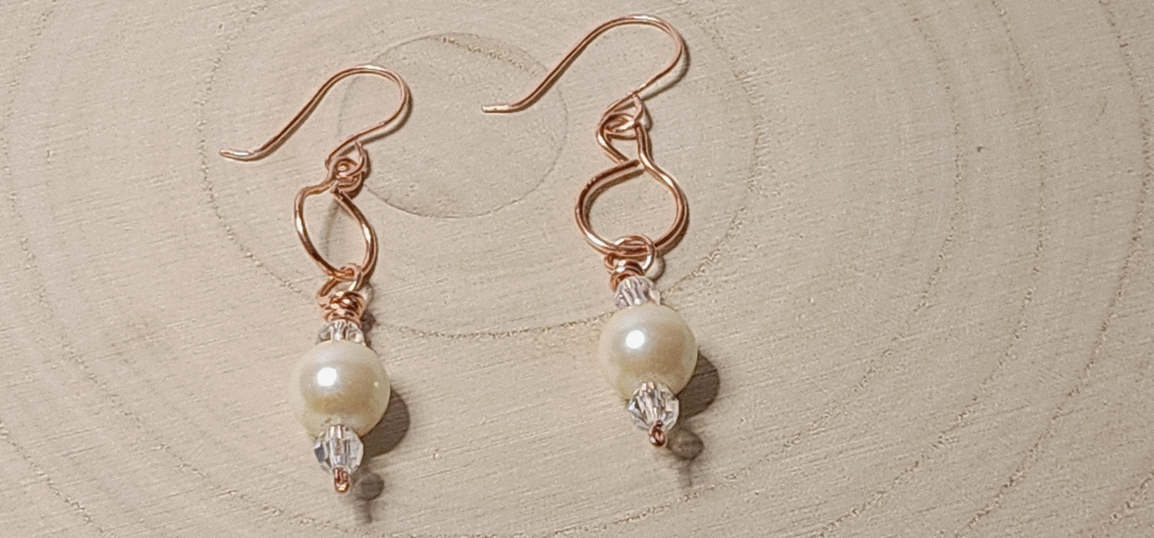 Each pair is handcrafted with care using high-quality faux pearls, faceted clear crystal bi-cone beads, and polished blue hematite beads. The figure-8 is formed with 16 gauge bare copper wire and the beads are arranged on an 18 gauge head pin , then attached to the figure-8 with a wrapped coil loop for a secure and comfortable fit. Each pair has handcrafted copper ear wires attached. Every set is made by hand, making each pair a unique piece of wearable art.
