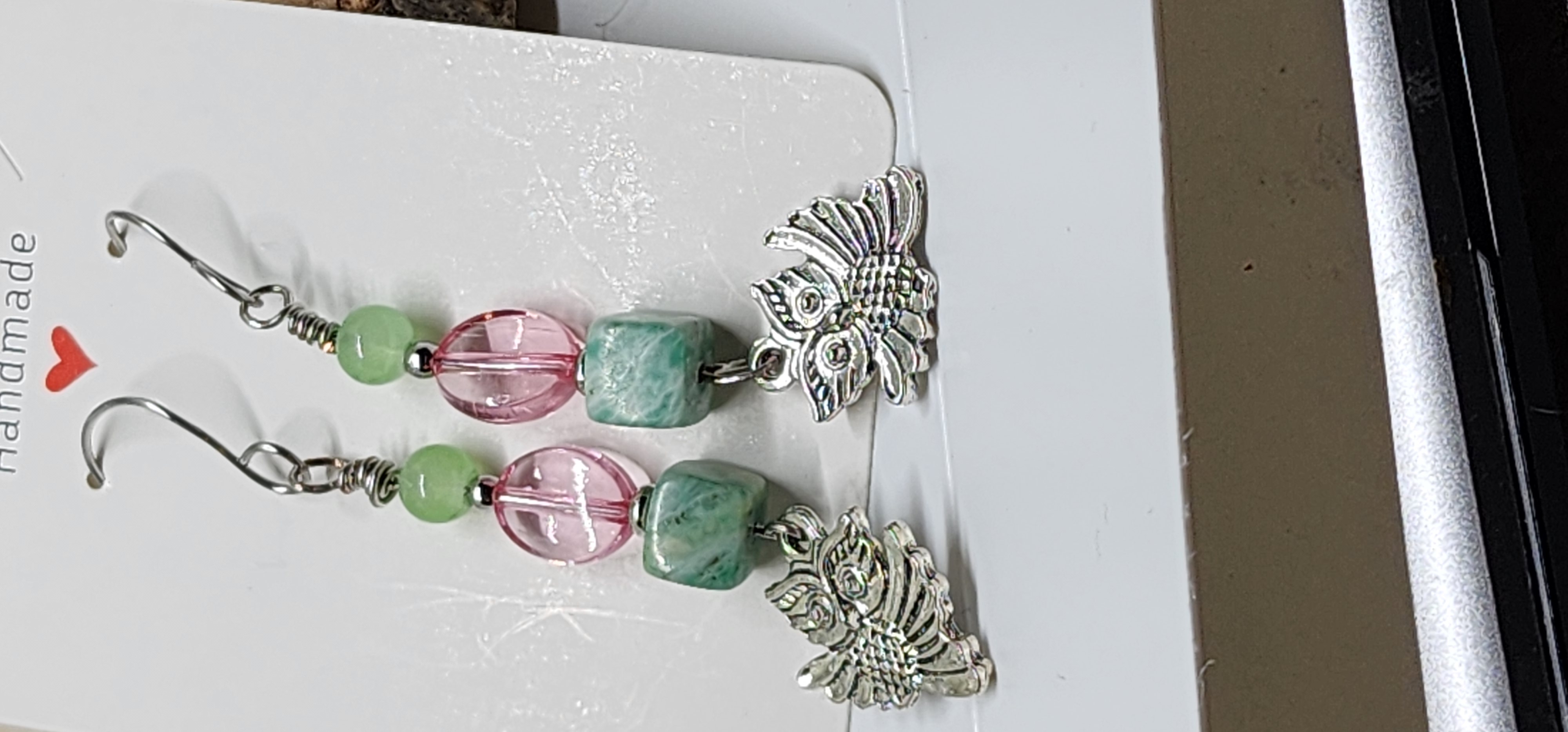 These earrings are carefully handcrafted by me using individually selected beads and silver-tone findings. Each bead is hand-assembled onto durable wire, wrapped securely for strength and longevity, then finished with detailed owl charms and fishhook ear wires. Every pair is made with attention to detail, ensuring quality, durability, and a beautifully balanced design.