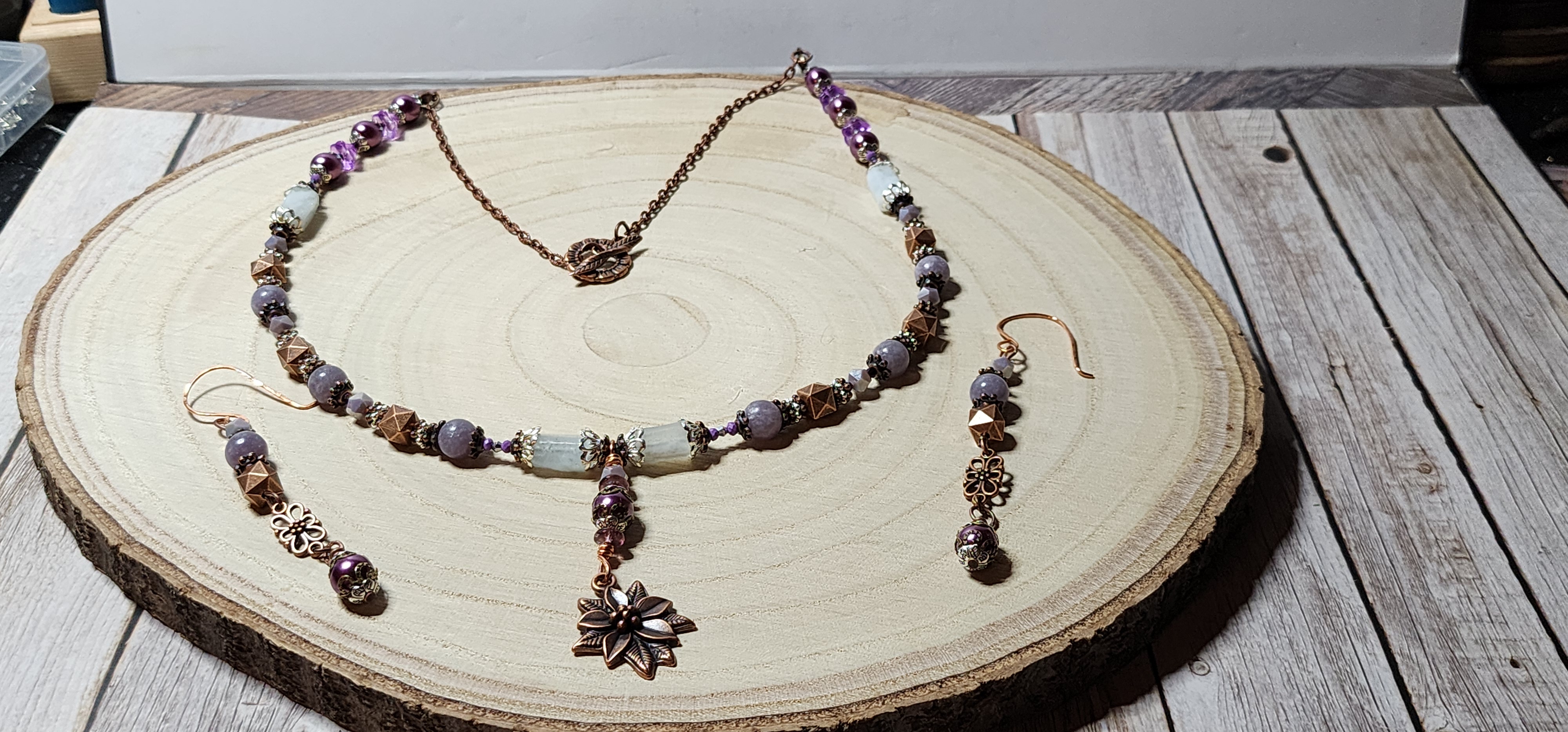 • Purple Lepidolite, Aquamarine , and copper metallic beads with antique copper floral accents