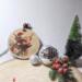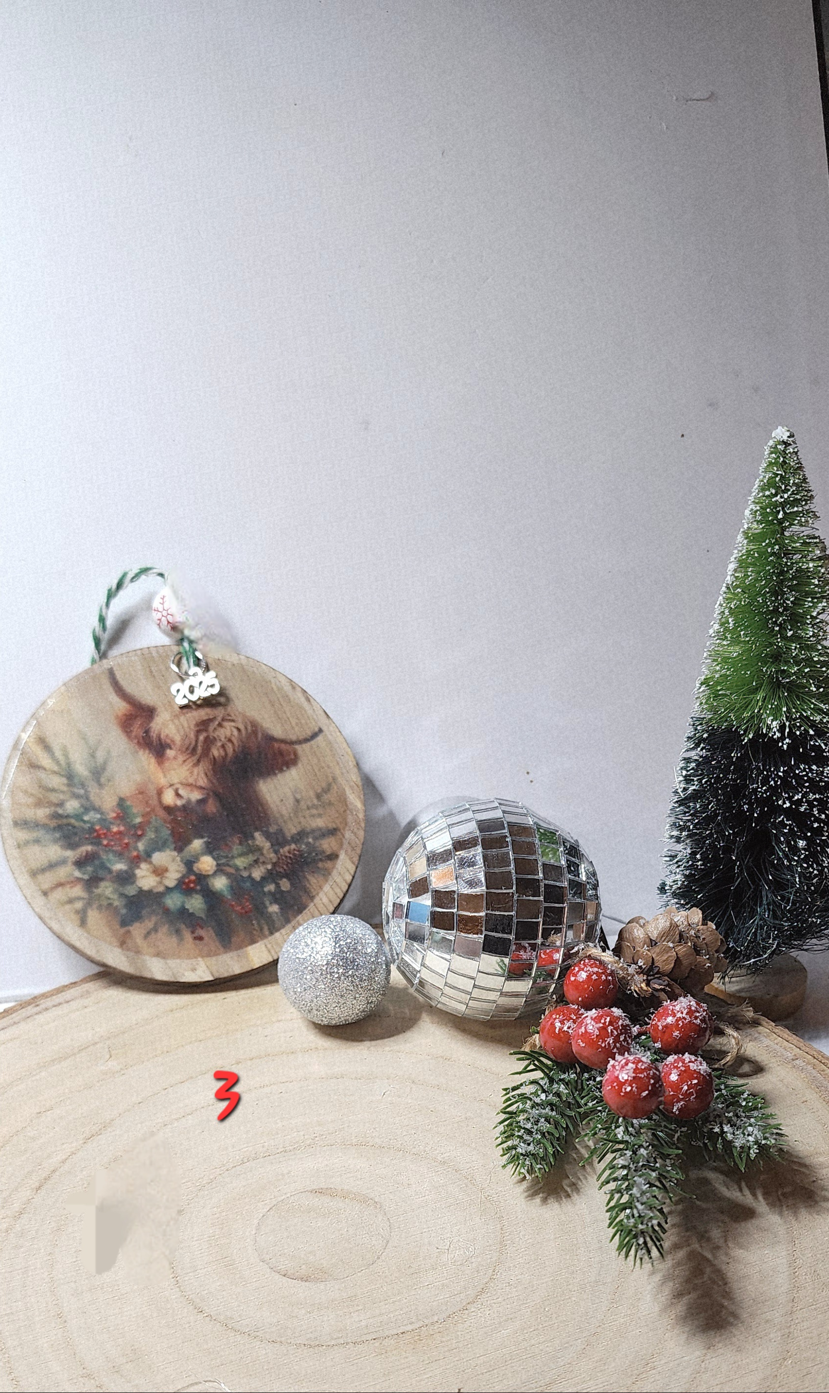 4" wood slice with image printed on transparent sticker paper and sealed with clear acrylic sealant. A hole is drilled at the top where a piece of bakers twine is put through and a 2025 silver-colored charm and wooden bead is attached.