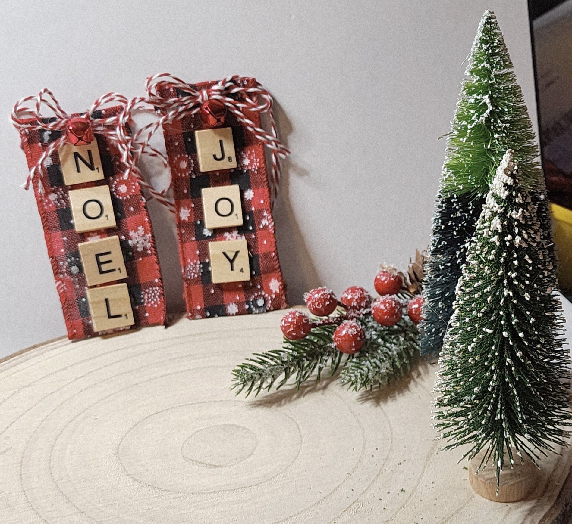 Each ornament is crafted by hand using a wired plaid Christmas themed plaid fabric. The words are spelled out with real wooden Scrabble-style tiles, carefully arranged and secured. A festive bow is tied with red and white baker’s twine, finished with a shiny red jingle bell for the perfect holiday touch. Lightly dusted with love and Christmas spirit before being sent your way! These ornaments are fully customizable!