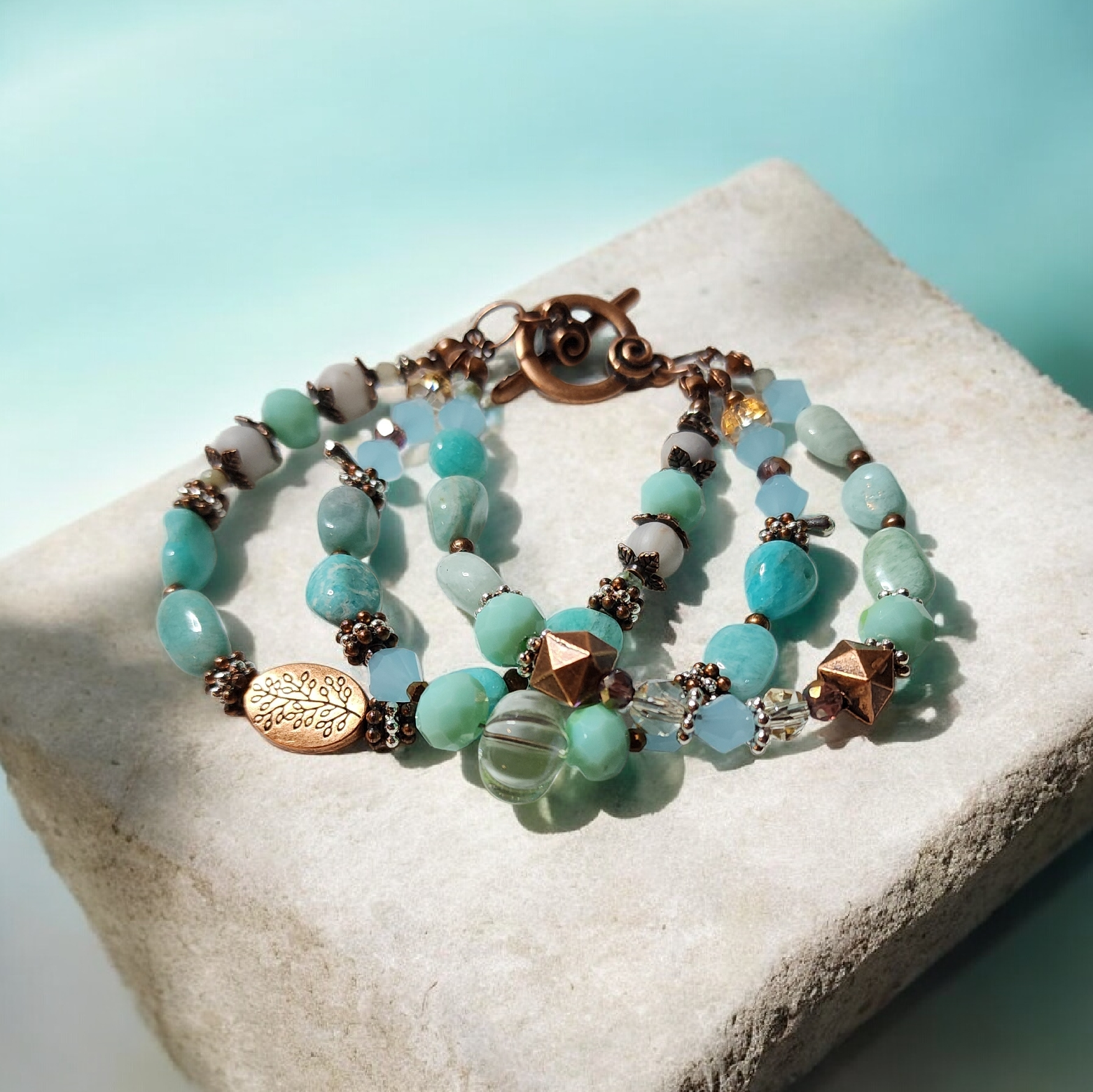 Infused with woodland warmth and artisan soul, this handcrafted triple strand bracelet features a stunning mix of Amazonite, White Agate and glass beads, accented by faceted metallics and copper-toned spacers. A spiral toggle clasp adds rustic elegance, while the copper-toned lea focal charm—engraved with a delicate branch motif—whispers of forest walks and quiet magic.