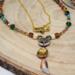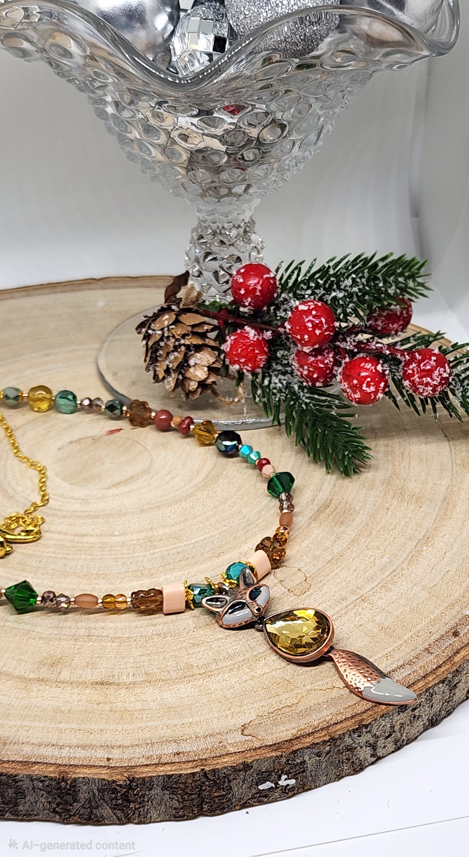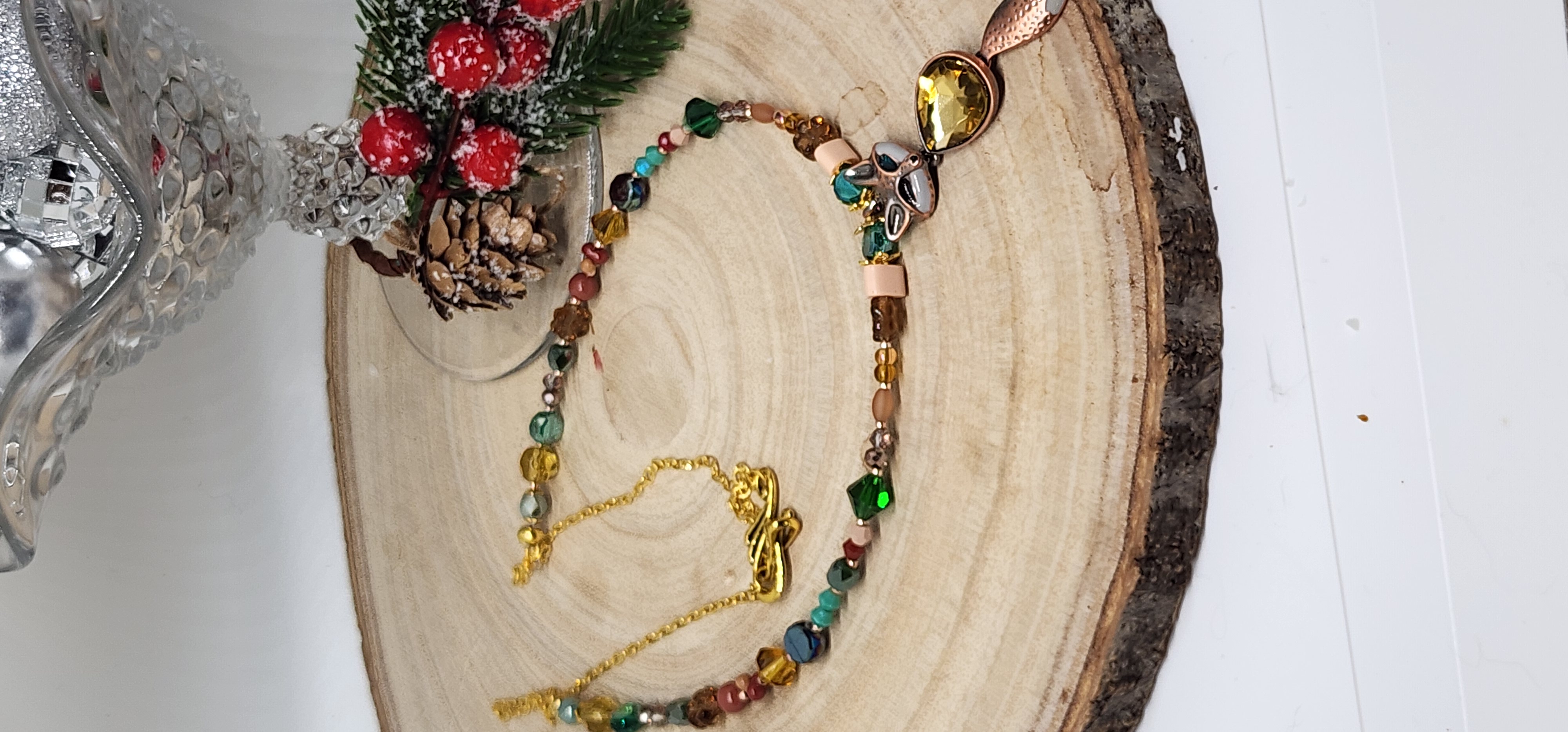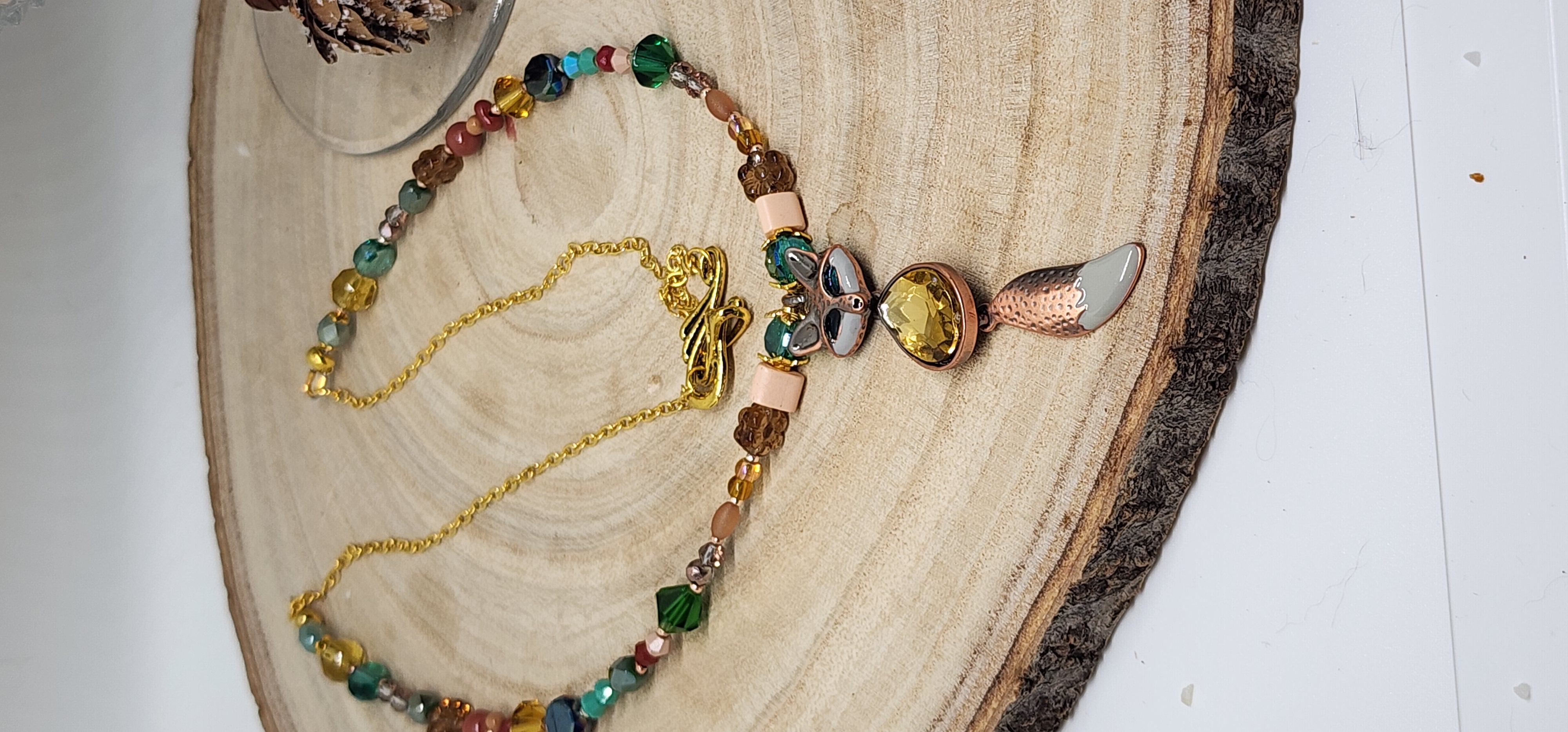 Celebrate the magic of winter with this handcrafted Woodland Fox Necklace — a tribute to forest folklore and festive sparkle. Featuring a striking amber-colored gem nestled in a golden fox pendant, this piece is surrounded by a rich mix of earthy beads in turquoise, moss green, bronze, and gold. Each bead is chosen to evoke the warmth of a woodland walk and the shimmer of holiday lights.